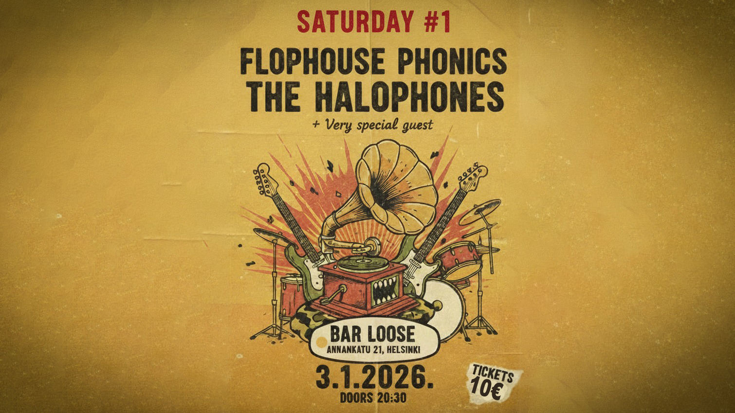 Flophouse Phonics is roughly seven-piece circus from Helsinki, known for their electrifying blend of holy boogie and controlled chaos. Their sound fuses the playful groove of Black Flag with the seriousness of Earth, Wind & Fire. The Flop Boys label themselves as ”the only Finnish major rock band that engages horns and percussion shit”. As vivid as that sounds, it should be added that most people label them as ska-boosted funkish rock’n’roll.