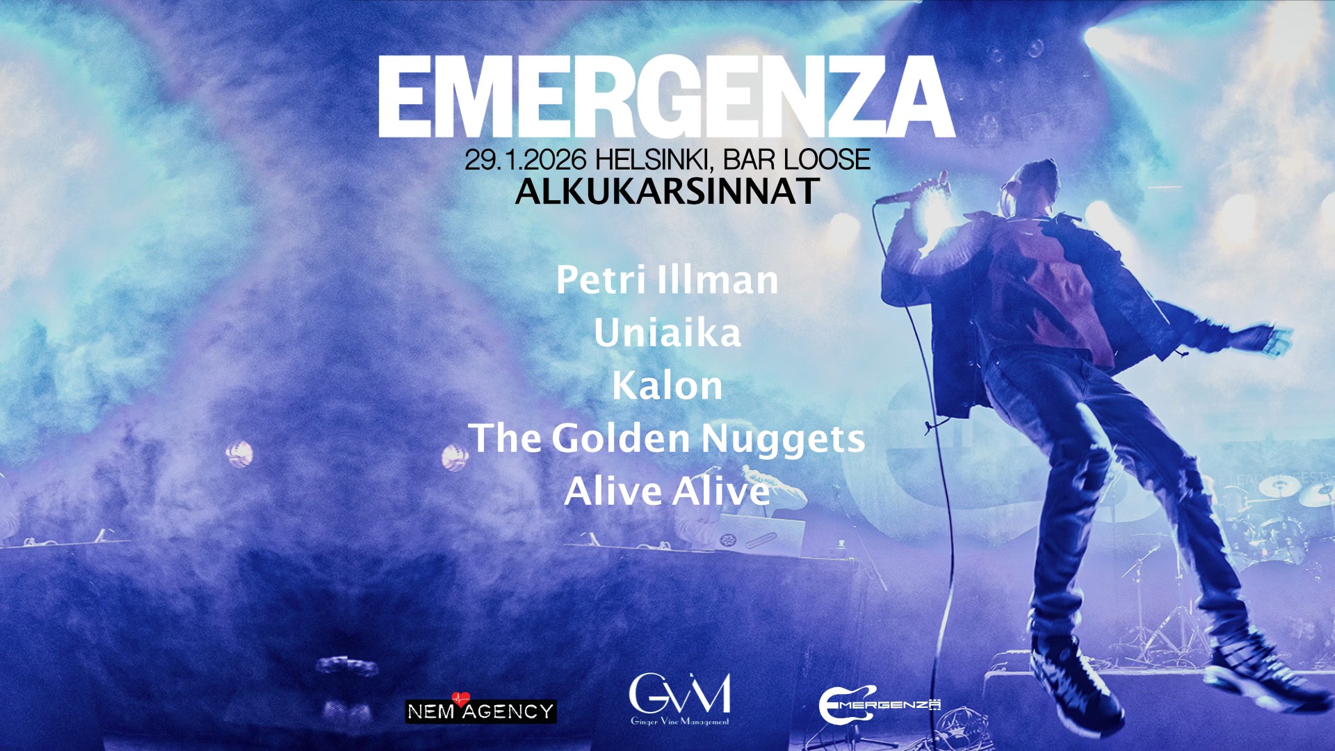 tammi 29 7:00 pm - 11:30 pm EMERGENZA FESTIVAL DAY 5: Petri Illman, Uniaika, Kalon, The Golden Nuggets, Alive Alive, Heiskanen & Muut 11€