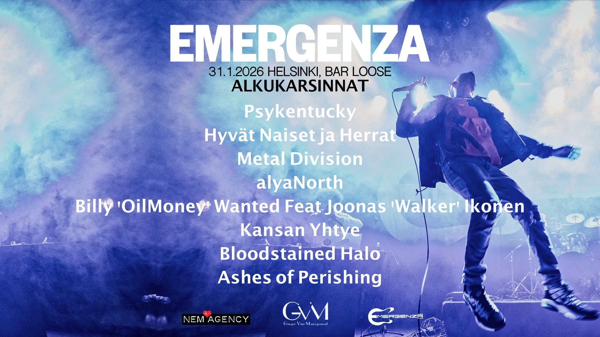 tammi 31 7:00 pm - 11:30 pm EMERGENZA FESTIVAL DAY 7: Psykentucky, Hyvät Naiset ja Herrat, Metal Division, alyaNorth, Billy ’OilMoney’ Wanted Feat Joonas ’Walker’ Ikonen, Kansan Yhtye, Bloodstained Halo, Ashes of Perishing 11€