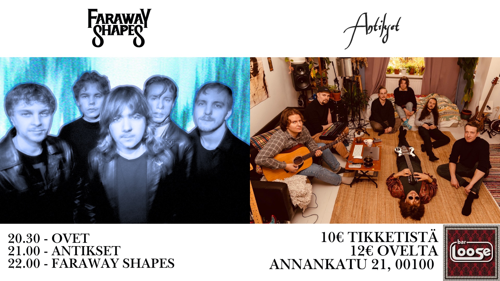Yläkerrassa on iso baarin puoli eli Bar Loose ja alakerrassa sijaitsee Club Loose, jossa järjestetään 4-5 kertaa viikossa elävää musiikkia rockin ja popin kautta aina jatsiin ja death metalliin. Laatu edellä, genret vasta sitten perässä. Viikonloppuöisin bändien jälkeen Bar Loosen “montussa” kaupungin kuumimmat tiskijukat soittavat parasta levymusiikkia. Tule sellaisena kuin olet ja nauti!