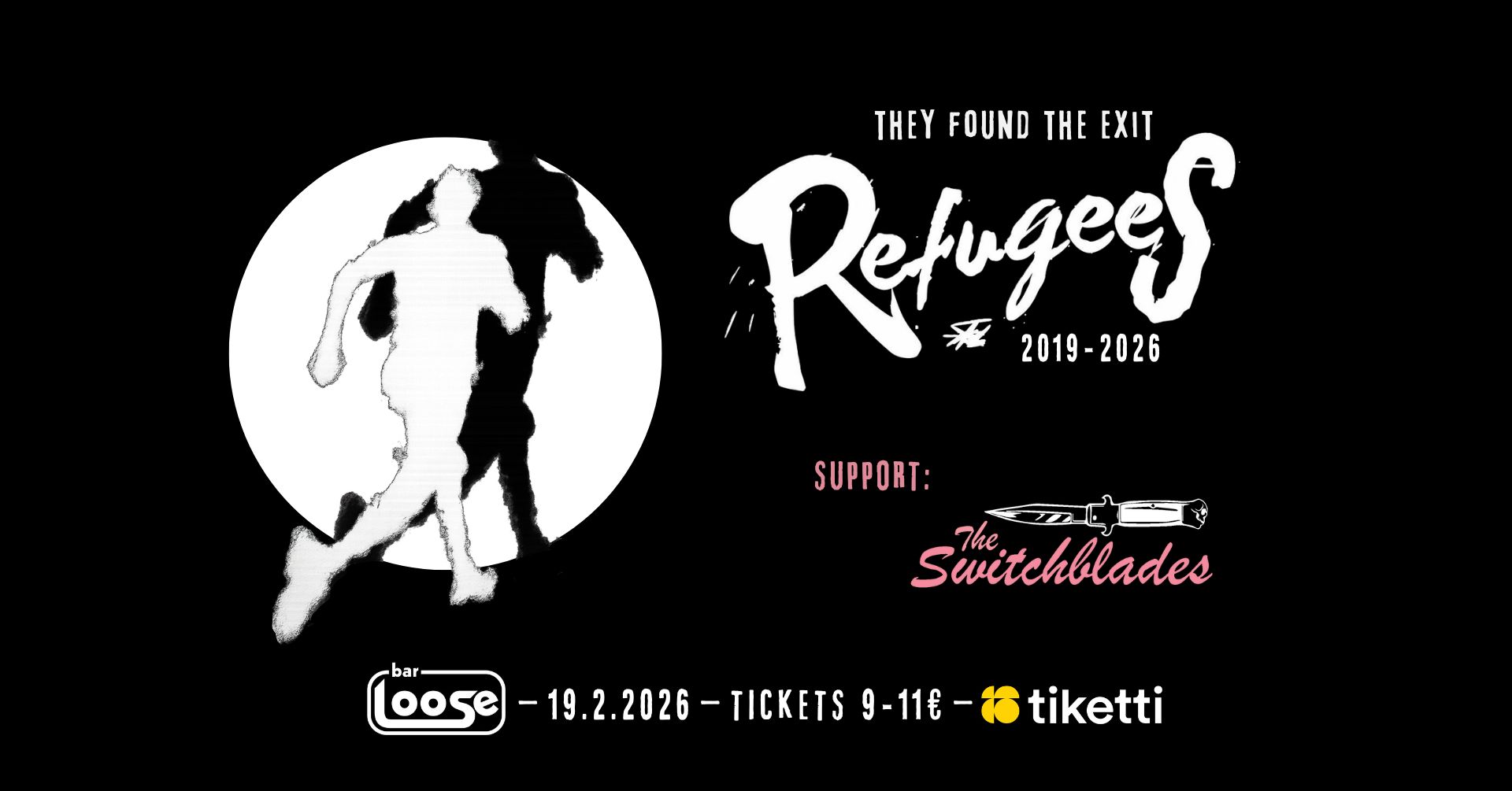 Helmikuussa saatetaan yksi aikakausi päätökseen, kun stadin kaaottisin, hedonistisin ja epävireisin yhtye eli REFUGEES astuu lavalle viimeistä kertaa. Erakoituneet ja rakastetut luuserit järjestävät monttubileet helmikuussa 19.2. Bar Loosessa. Viimeisissä Refubileissä mukana soittamassa törkeä, uunituore ja anteeksipyytelemätön rock ‘n’ roll yhtye THE SWITCHBLADES.