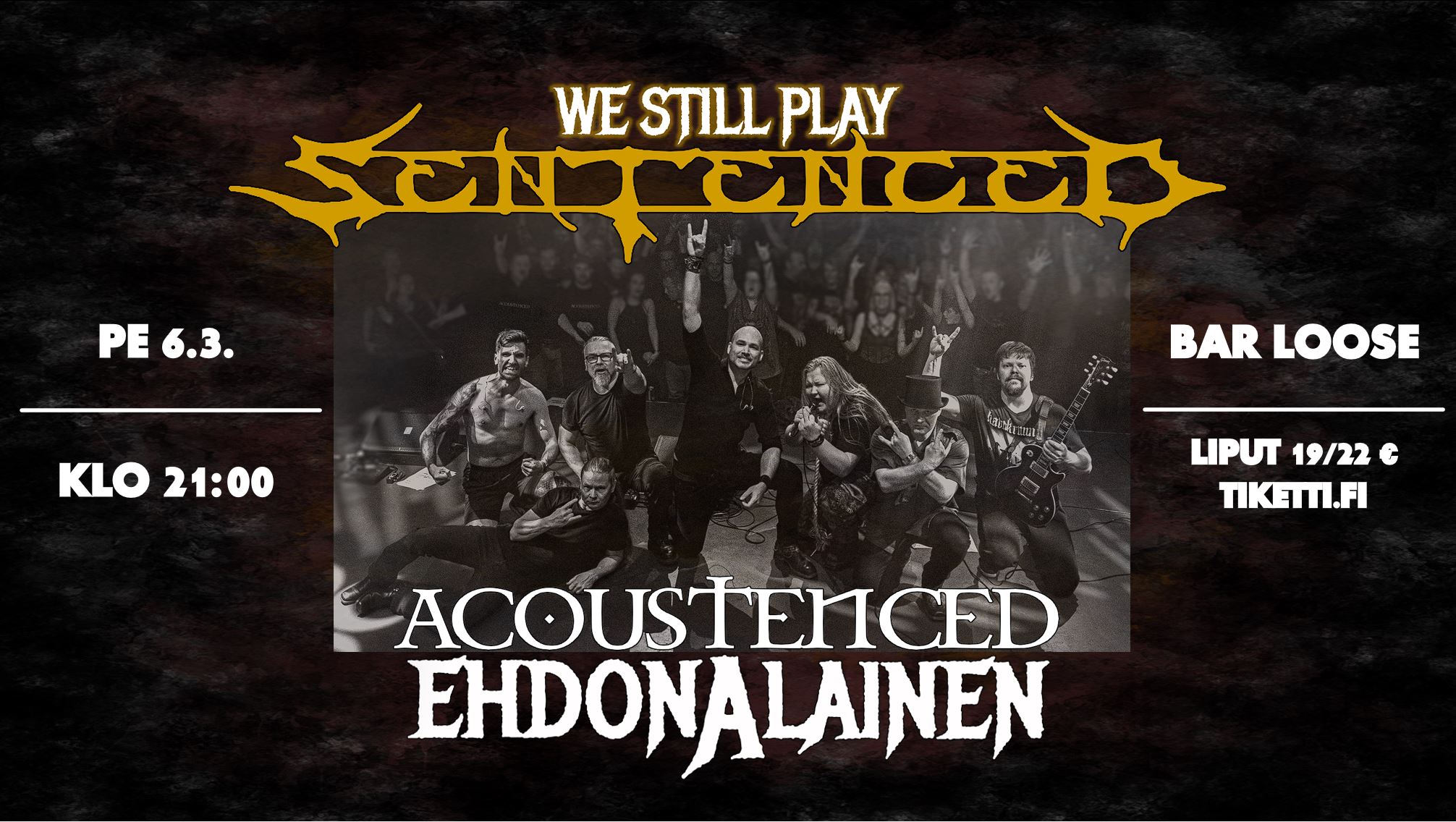 “Acoustenced & Ehdonalainen soittavat Miika Tenkulan syntymäpäivänä yhteiskeikan Bar Loosessa perjantaina 6.3.2026. Settilistoihin on saatu lisättyä uusia biisejä, joten tuttu ja turvallinen ei toteudu tälläkään kertaa. Juhli tai et, kunhan tulet!